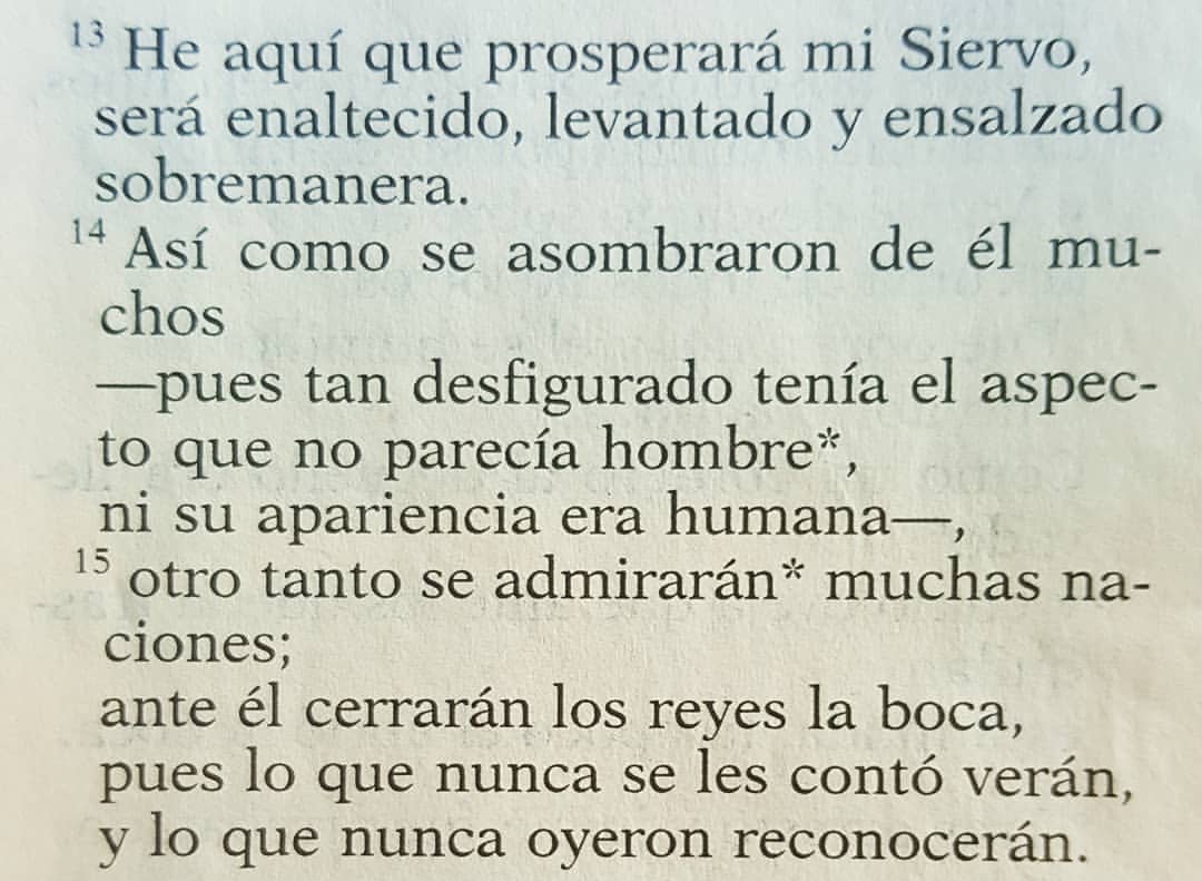 Isaías 52:13-15 «He aquí (¡»Miren con cuidado y detenimiento!») que MI Siervo (NO es Israel, NO es David, Jeremías, Isaías ni Zorobabel, es el Señor Jesús, Ver Hechos 2:33 y 8:34-35) será prosperado (Textual dice que actuará sabiamente, la NVI dice que triunfará), será engrandecido (levantado, afamado y enaltecido, ÉL triunfará al establecer Justicia y derecho sin igual) y exaltado (Ver Filipenses 2:6-11), y será puesto muy en alto. Como (así como, de la misma manera) se asombraron (quedaron espantados, horrorizados y asolados tras la 1ª Venida.) de TI muchos, de tal manera fue desfigurado (terriblemente maltratado, con el rostro irreconocible, sin rasgos humanos, ni prácticamente apariencia humana) de los hombres su parecer (perdió, por la crueldad, el semblante y apariencia humana. Fue un sufrimiento sin igual; se espantaron de ÉL al verlo), y su hermosura más que la de los hijos de los hombres, así (así mismo) asombrará (de esa misma manera ÉL asombrará en SU Gloriosa 2ª Venida) ÉL a muchas naciones (rociará o esparcirá a muchas naciones con una limpieza espiritual); los reyes cerrarán ante ÉL la boca (los mayores líderes y gobernantes humanos quedarán atónitos y pasmados ante ÉL, ante quien despreciaron un día), porque verán lo que nunca les fue contado (a pesar de que muchos NO han oído el Mensaje del Evangelio, ese Día, sabrán Quién es ÉL), y entenderán (comprenderán) lo que jamás habían oído (contemplará lo insólito dice la Textual).»