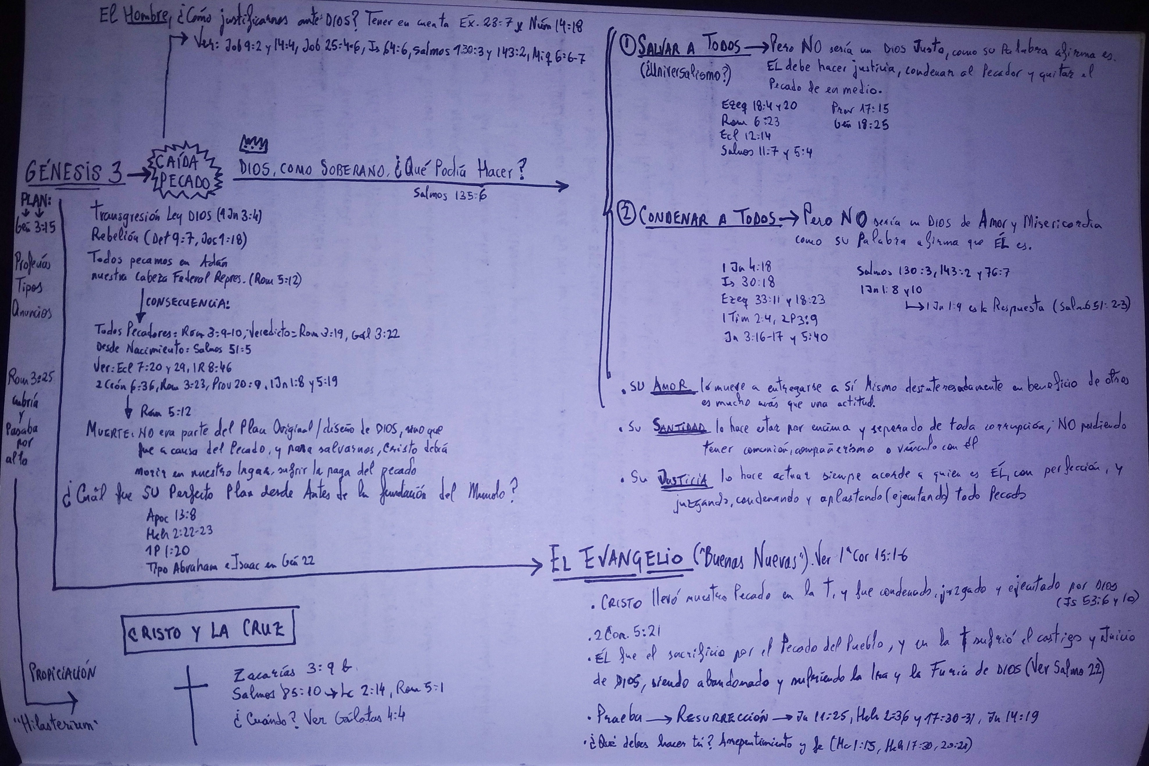 Dios, a través de Su Eterno Hijo Jesús, se hace hombre, viviendo una Perfecta Vida en obediencia al Padre en Todo, y a la edad física de 33 años de edad, se dirije a la Cruz, y allí, en esa Cruz, Todos, absolutamente Todos los Pecados de la Humanidad (una humanidad pecadora y merecedora del Juicio de Dios) son puestos sobre EL, y Su propio Padre los juzga con SU Justicia, y quebranta a Su Propio Hijo y lo aplasta con Su Furor e Ira.